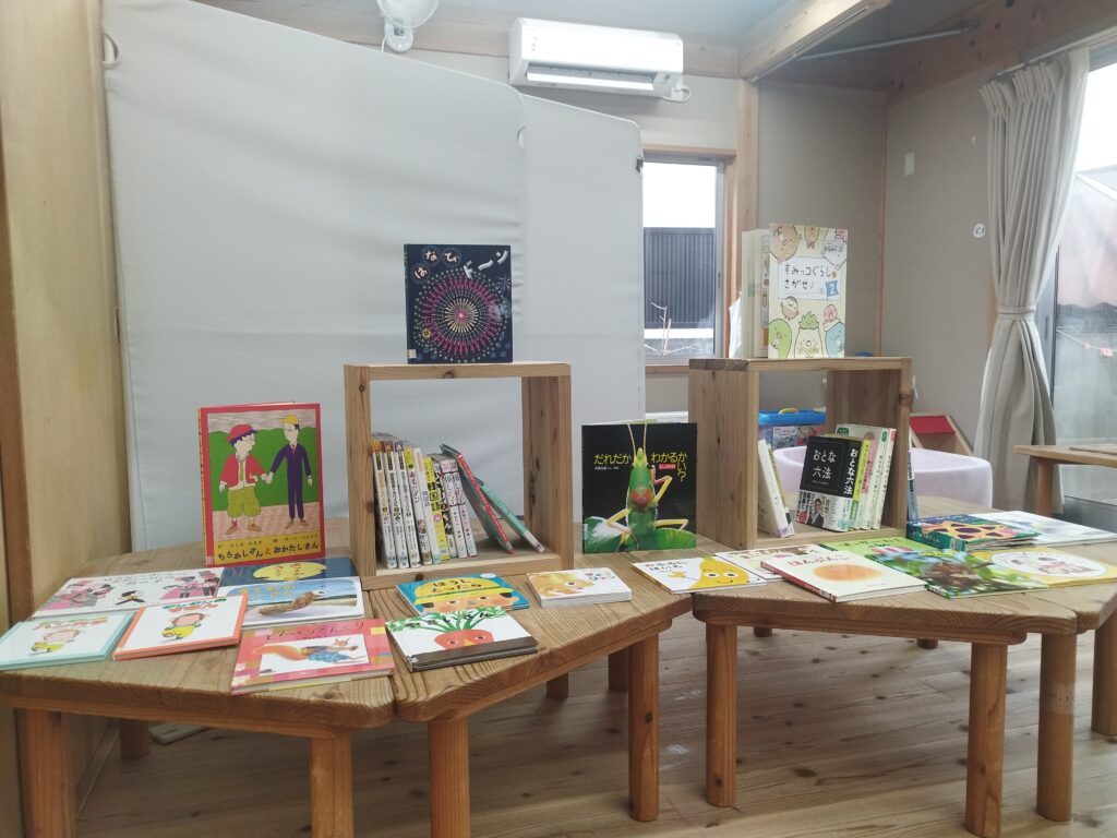 小さな図書コーナーは、こども達だけでなく、大人も手にとりたくなるような本を持っていきました。