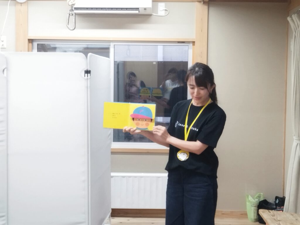 スタッフ2名と学生ボランティア2名で、たねとしずくライブラリーの一箱本棚とたくさんの絵本を持って行きました。